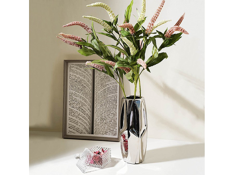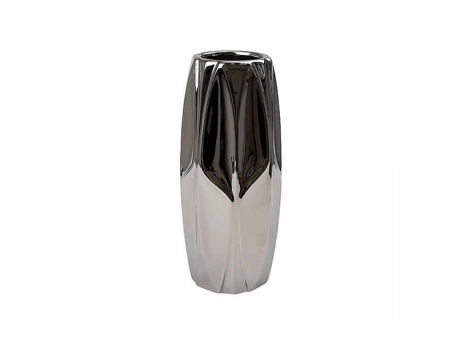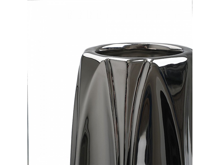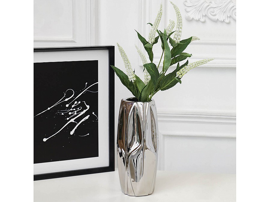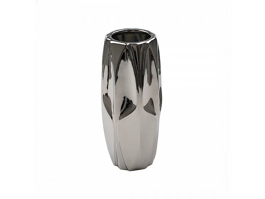 Секрет притягательности вазы "Контур" кроется в ее необычной форме и эффектном металлическом покрытии. Интересная геометрия рельефа в тандеме с блеском металла создают красивый объемный силуэт модели. Ваза для цветов может солировать без наполнения, как одиночно, так и в составе нескольких декоративных аксессуаров, выдержанных в том же стиле. Создавая невероятную зеркальную магию, модель Cha27 добавит любому пространству динамики и оживит статичный интерьер. Изделие изготовлено из доломита (разновидность керамики), экологичного природного материала. На дне расположены мягкие подушечки, которые предотвращают появление царапин на поверхности, на которой стоит ваза.