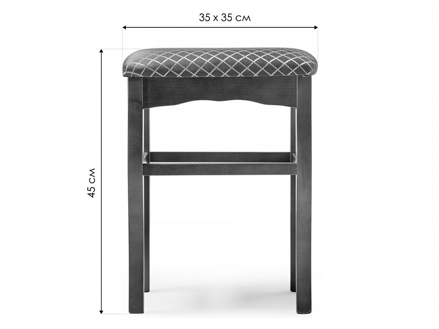 Материал каркаса - массив березы; Материал сиденья - ткань; Материал обивки - ткань; Ширина - 35; Глубина - 35; Высота сиденья - 45;